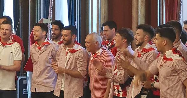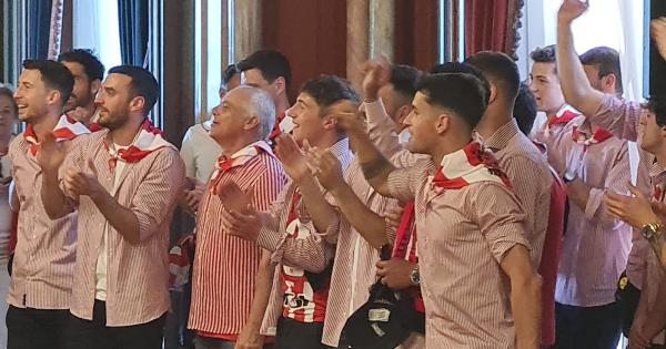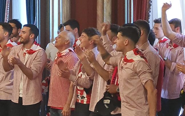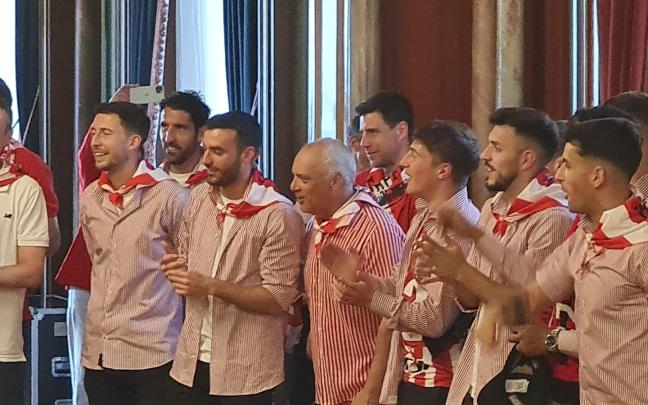 Previo a la salida al balcón, los jugadores han sido recibidos con un pasillo de dantzaris y un aurresku de honor.