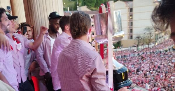 Desde el balcón, orquestados por Iker Muniain, todos los jugadores de la plantilla, además de Iribar, Jon Uriarte y Ernesto Valverde, han dedicado unas palabras a los aficionados congregados enfrente del edificio al mismo tiempo que coreaban diferentes cánticos.