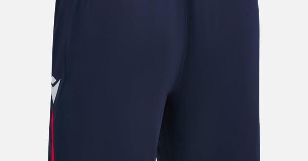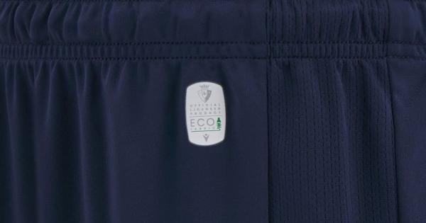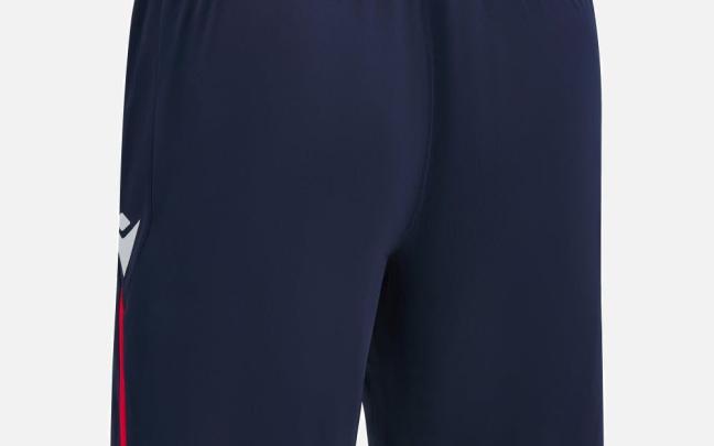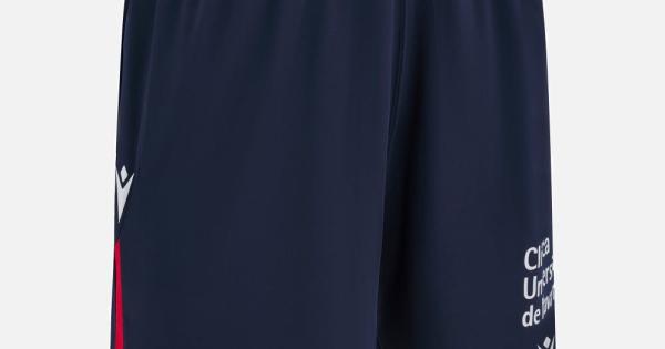 La equipación local se completa con un pantalón corto azul con dos finas franjas rojas en los laterales. Las medias son negras con el borde superior rojo. El corte es 'Slim Fit', el tejido principal utilizado es 'Eco Softlock' y la presencia de inserciones de 'Eco Mesh' hacen que la prenda sea especialmente ligera y garantiza una perfecta transpirabilidad.