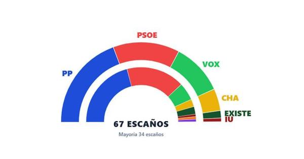El PP gana las elecciones y obtiene 26 diputados, dos menos que en 2023. El PSOE ha perdido cinco escaños respecto a los comicios anteriores, por lo que se queda con 18. Vox ha pasado de 7 a 14; CHA de 3 a 6; la coalición Existe ha perdido uno de sus tres diputados, IU-Sumar se queda con uno. Por su parte, el PAR y Podemos Alianza Verde se despiden de las Cortes de Aragón.
