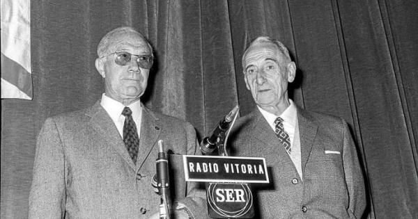 Jacinto Quincoces (izquierda) y Ciriaco Errasti (derecha) en Vitoria el 1 de abril de 1971. En sus tiempos de futbolistas fueron considerados como una de las mejores defensas del mundo. Foto: Archivo Municipal de Vitoria: Arqué