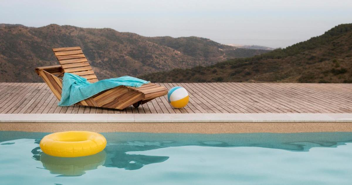 Tumbona de madera junto a la piscina y con vistas al monte.