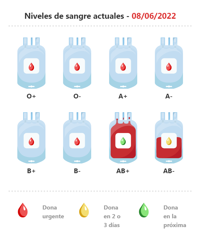 Los niveles de reservas de sangre en Euskadi están bajos. La proximidad de las vacaciones y el hecho de que algunos elementos como las plaquetas sólo se puedan almacenar durante un período corto -5 días- hace que, de cara a la temporada veraniega, las reservas estén en niveles muy bajos. A fecha de 8 de junio de 2022, el único grupo sanguíneo con el nivel de reserva en verde es el del grupo AB+.