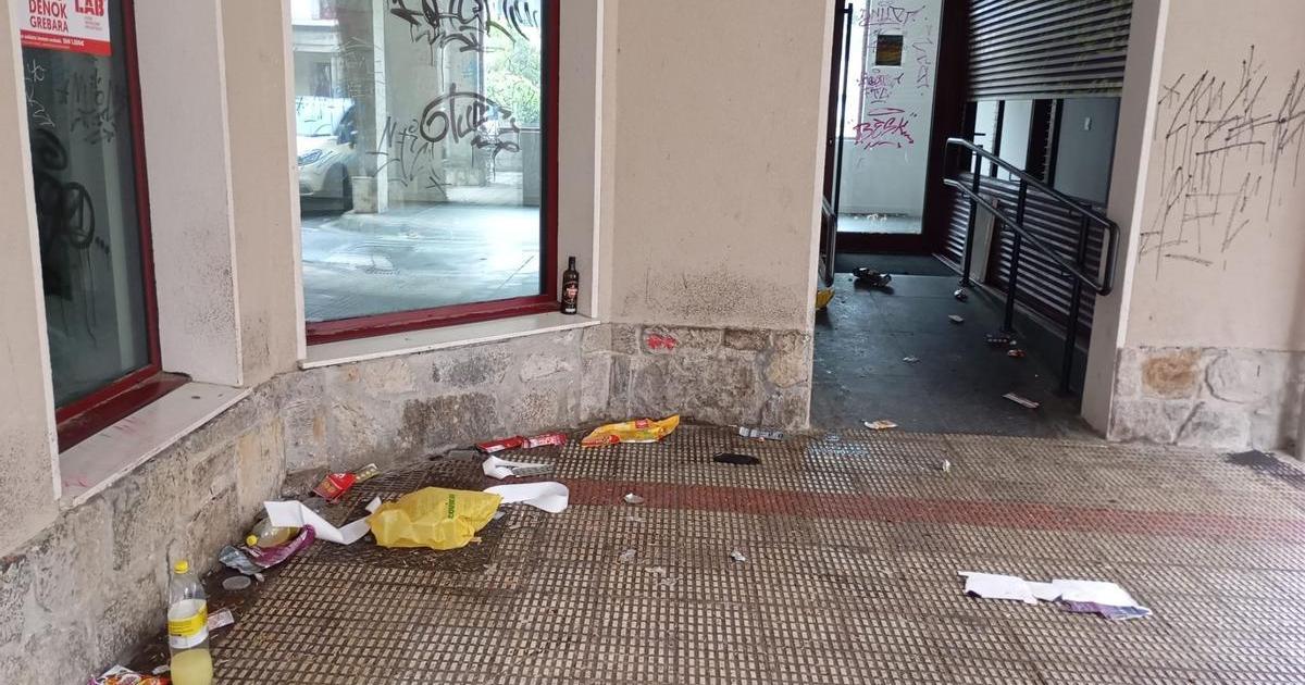La mugre y los destrozos aumentan a ojos vista en los soportales de la antigua casa de los sindicatos del Grupo San Juan de Arrasate, hoy reconvertida en alojamientos dotacionales para jóvenes, según denuncian vecinos de la zona. Este recodo se ha convertido, siempre en base a su testimonio, en lugar habitual para que decenas de jóvenes se reúnan "a beber, comer y fumar porros, dejando gran cantidad de basura y porquería, sumada a orines y otros residuos"; una situación que, aseguran, "indigna" tanto a quienes viven en el entorno como a paseantes, y enoja a los trabajadores del servicio municipal de limpieza.