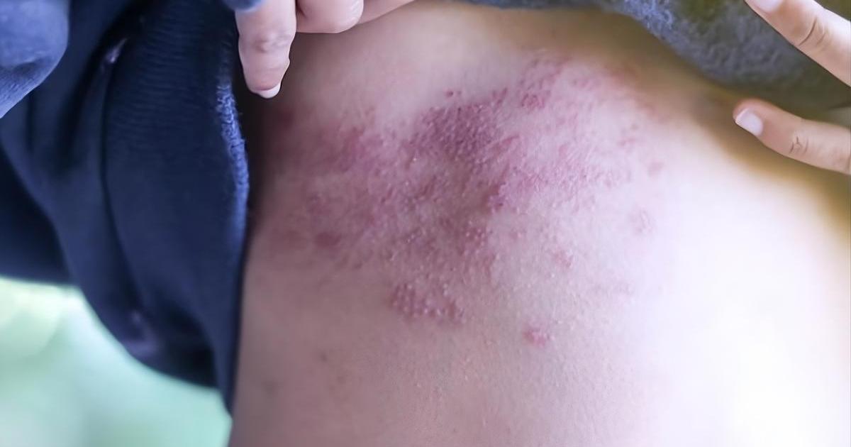 Días después, en esa misma zona comienza a aparecer la erupción cutánea. Primero se presenta como manchas rojizas que evolucionan hacia vesículas o ampollas agrupadas, llenas de líquido. Estas lesiones siguen el trayecto de un nervio (dermatoma) y se distribuyen en forma de banda. Suelen localizarse en el tronco, especialmente en la zona lumbar o cervical, aunque también pueden afectar al rostro, el ojo o el oído.