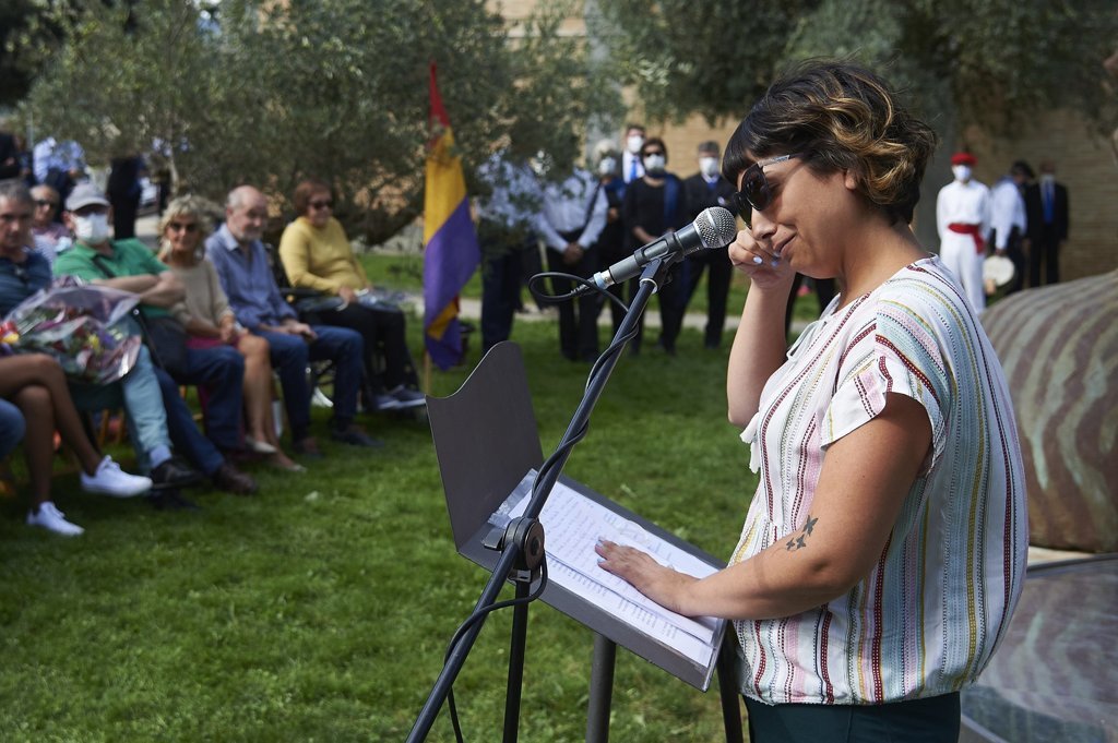 La consejera de Relaciones Ciudadanas también dedicó unas palabras a Cielo de tierra, la escultura de Ramón Llamas que desde noviembre preside el Parque de la Memoria. "Homenajea a todas las víctimas de la violencia del franquismo, una violencia que además pretendió matar su recuerdo y su memoria", recordó.