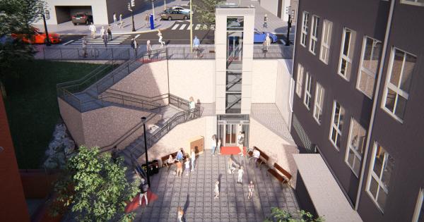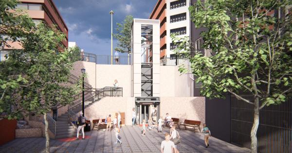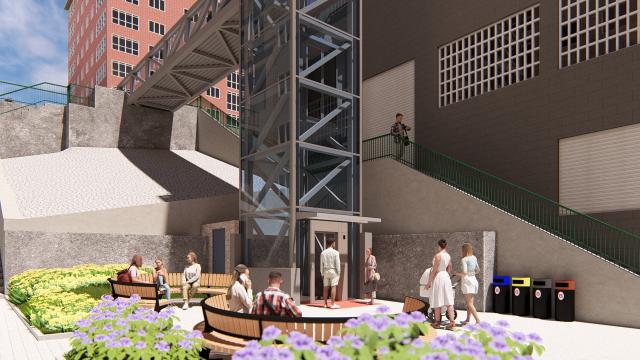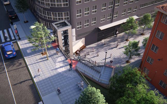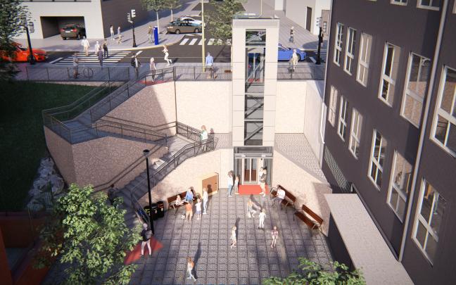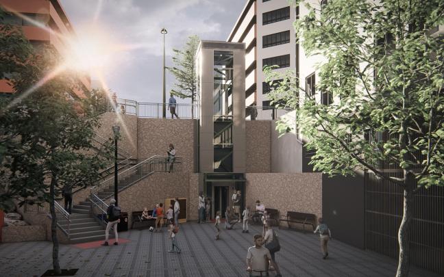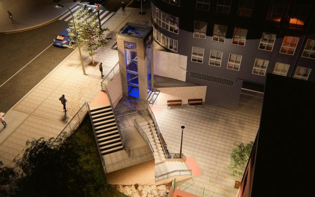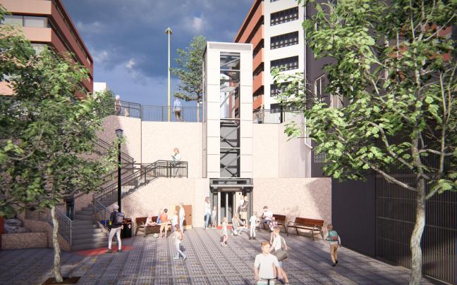 El nuevo elevador se instalará en sustitución de las escaleras existentes y salvará un desnivel de 6,37 metros, con dos paradas.