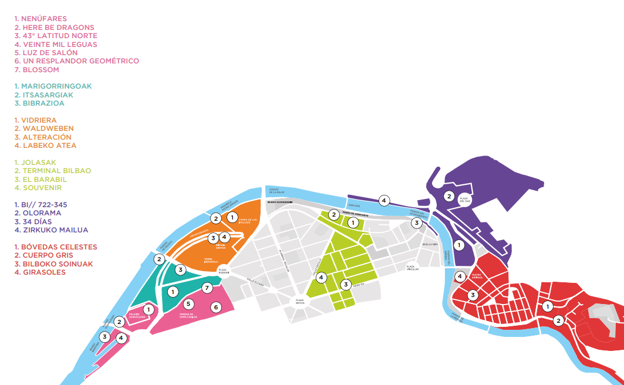 Iglesia de la Encarnación; Museo de Arte Sacro de Bilbao; Catedral de Santiago; Plaza Arriaga; Paseo del Arenal; Plaza del Gas; Paseo Uribitarte; Paseo del Campo Volantín; Plaza de la Convivencia; Plaza Ensanche; Sociedad Filarmónica de Bilbao; Edificio CRAI; Pasarela Pedro Arrupe; Bizkaia Aretoa UPV/EHU; Avenida Abandoibarra; Puente de Deusto; Palacio Euskalduna; Muelle Churruca; Itsasmuseum; Muelle Ramón de la Sota; y Parque de Casilda Iturrizar.