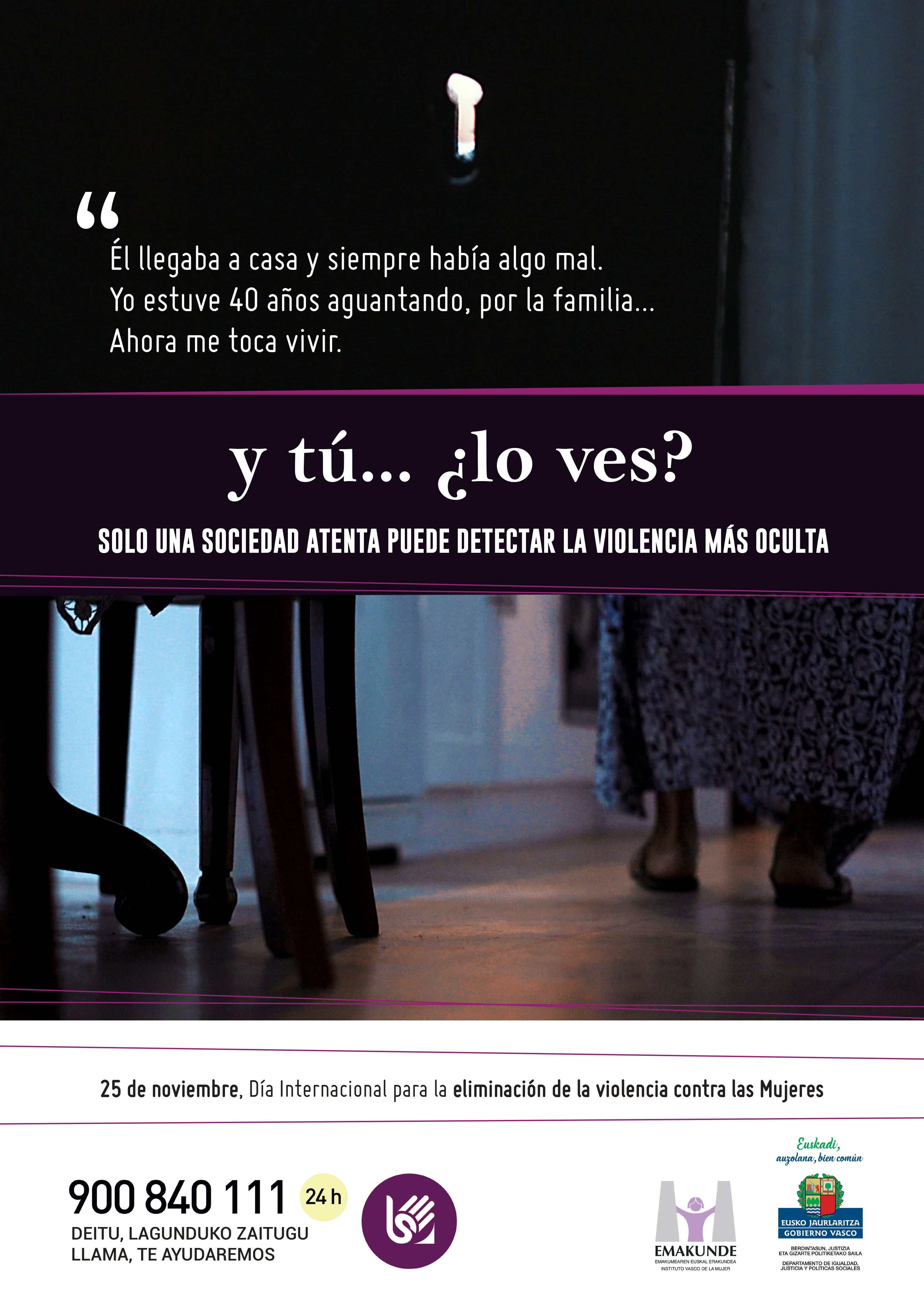 La consejera de Igualdad, Justicia y Políticas Sociales, Beatriz Artolazabal, y la directora de Emakunde, Izaskun Landaida han presentado la campaña diseñada con motivo del 25 de noviembre, Día Internacional para la Eliminación de la Violencia contra las Mujeres. Se trata de una campaña que da continuidad al trabajo realizado por Emakunde el año pasado con mujeres de entre 55 y 79 años, que aportaron testimonios reales de la violencia vivida durante muchos años. La campaña muestra algunos de esos testimonios y pregunta a la ciudadanía si es capaz de ver la violencia que se esconde tras ellos. 'Y tú ¿lo ves? Solo una sociedad atenta detecta la violencia más oculta' es el lema de esta campaña que insta a la sociedad a estar atenta ante situaciones de violencia cotidianas y en muchos casos normalizadas.