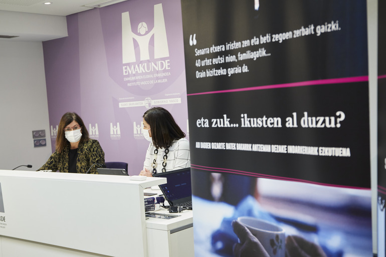 La consejera de Igualdad, Justicia y Políticas Sociales, Beatriz Artolazabal, y la directora de Emakunde, Izaskun Landaida han presentado la campaña diseñada con motivo del 25 de noviembre, Día Internacional para la Eliminación de la Violencia contra las Mujeres. Se trata de una campaña que da continuidad al trabajo realizado por Emakunde el año pasado con mujeres de entre 55 y 79 años, que aportaron testimonios reales de la violencia vivida durante muchos años. La campaña muestra algunos de esos testimonios y pregunta a la ciudadanía si es capaz de ver la violencia que se esconde tras ellos. 'Y tú ¿lo ves? Solo una sociedad atenta detecta la violencia más oculta' es el lema de esta campaña que insta a la sociedad a estar atenta ante situaciones de violencia cotidianas y en muchos casos normalizadas.