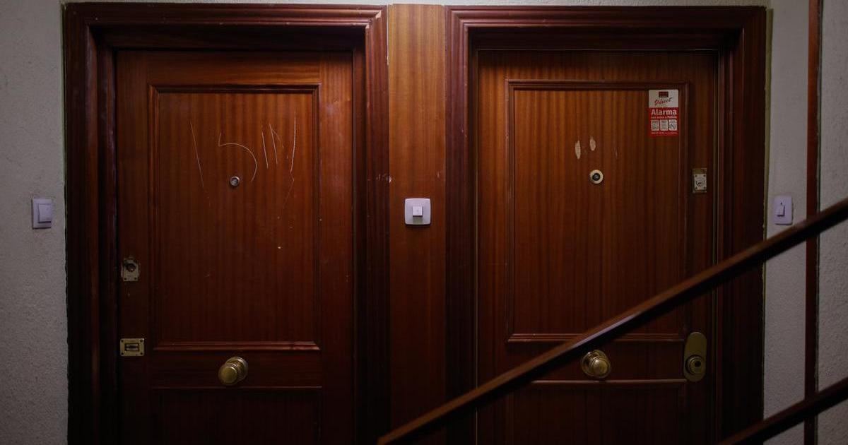 Puerta de la vivienda en la que un hombre ha asesinado a su pareja, en el distrito de Villaverde, este 21 de octubre. / EP
