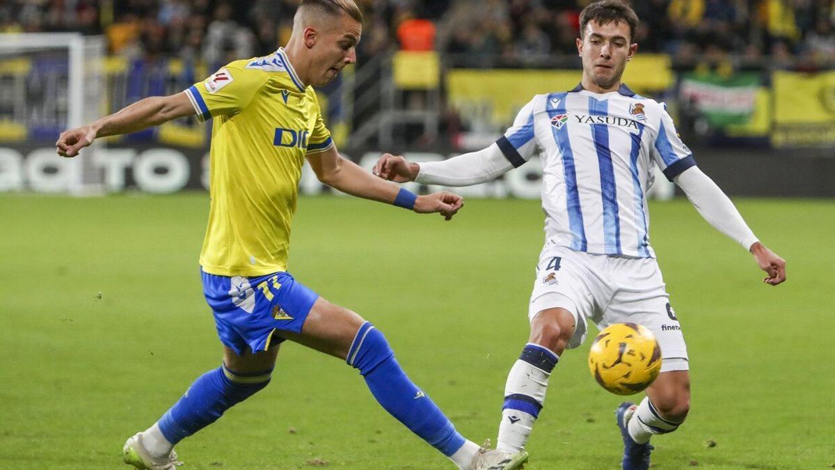 El entrenador de la Real Sociedad, Imanol Alguacil, fue claro ayer en la sala de prensa del Nuevo Mirandilla de Cádiz cuando le pidieron una valoración de la primera parte de la competición. No dudó en reafirmar los muchos logros que ha conseguido su equipo: "Es una valoración muy buena. Tenemos 31 puntos en la Liga a falta de una jornada para que acabe la primera vuelta, hemos sido primeros de grupo en la Champions League por delante de equipos como el Inter y el Benfica, nos jugaremos los octavos contra el PSG, también hemos pasado dos rondas de la Copa y los partidos que hemos empatado, en la mayoría de los casos, hemos estado muy cerca de ganarlos. Creo que el año ha sido muy bueno. Qué más le podemos pedir a estos jugadores", declaró.
