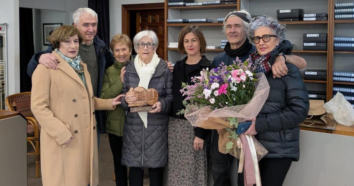 La alcaldesa de la localidad, Nagore Alkorta, le ha entregado un ramo de flores y una talla en madera de Mikel San Juan que representa la tienda de ropa de mujer Aldagoiti en la que trabajó durante tantos años y la Plaza Txikia de Azpeitia, en el transcurso de un encuentro en el que Ines ha estado acompañada por sus familiares.