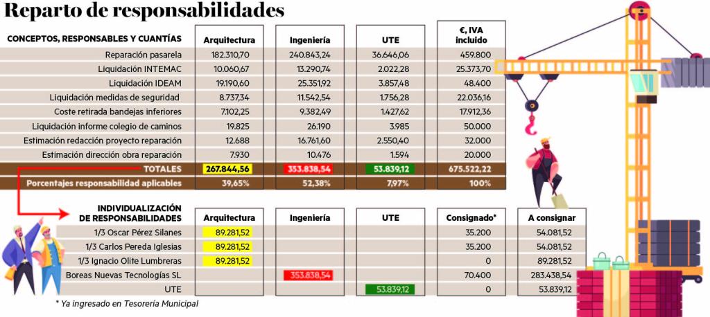 En él se establece la cuantificación de los daños encontrados en la estructura, el reparto de los mismos y de todos los gastos generados a las arcas municipales, así como una valoración del coste que supondrá la reparación de la pasarela, que se ha presupuestado en 459.000 euros. La ingeniería Boreas Nuevas Tecnologías SL es la que se lleva la peor parte. Según la valoración que ha realizado el Colegio de Ingenieros, se la considera responsable del 52,36% del total de los gastos, 353.000 euros.