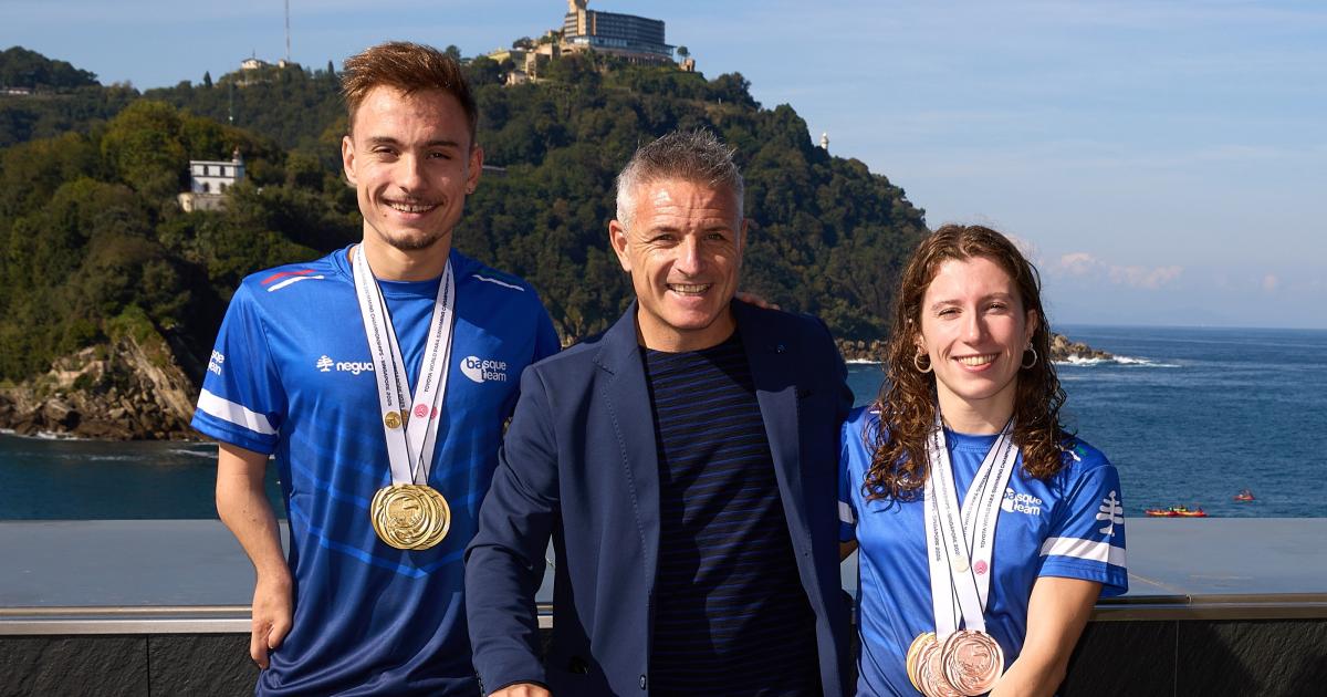 Los nadadores guipuzcoanos Iñigo Llopis y Nahia Zudaire, becados por Basque Team, han regresado a casa con un botín de cinco medallas obtenidas en el Campeonato del Mundo de Natación Paralímpica celebrado en Singapur. Ambos deportistas han sido recibidos en la terraza superior del Aquarium de Donostia en un emotivo acto de bienvenida en el que han participado Gorka Iturriaga, director de Actividad Física y Deporte del Gobierno Vasco, y Olatz Legarza, coordinadora de la Fundación Basque Team, además de numerosos medios de comunicación.