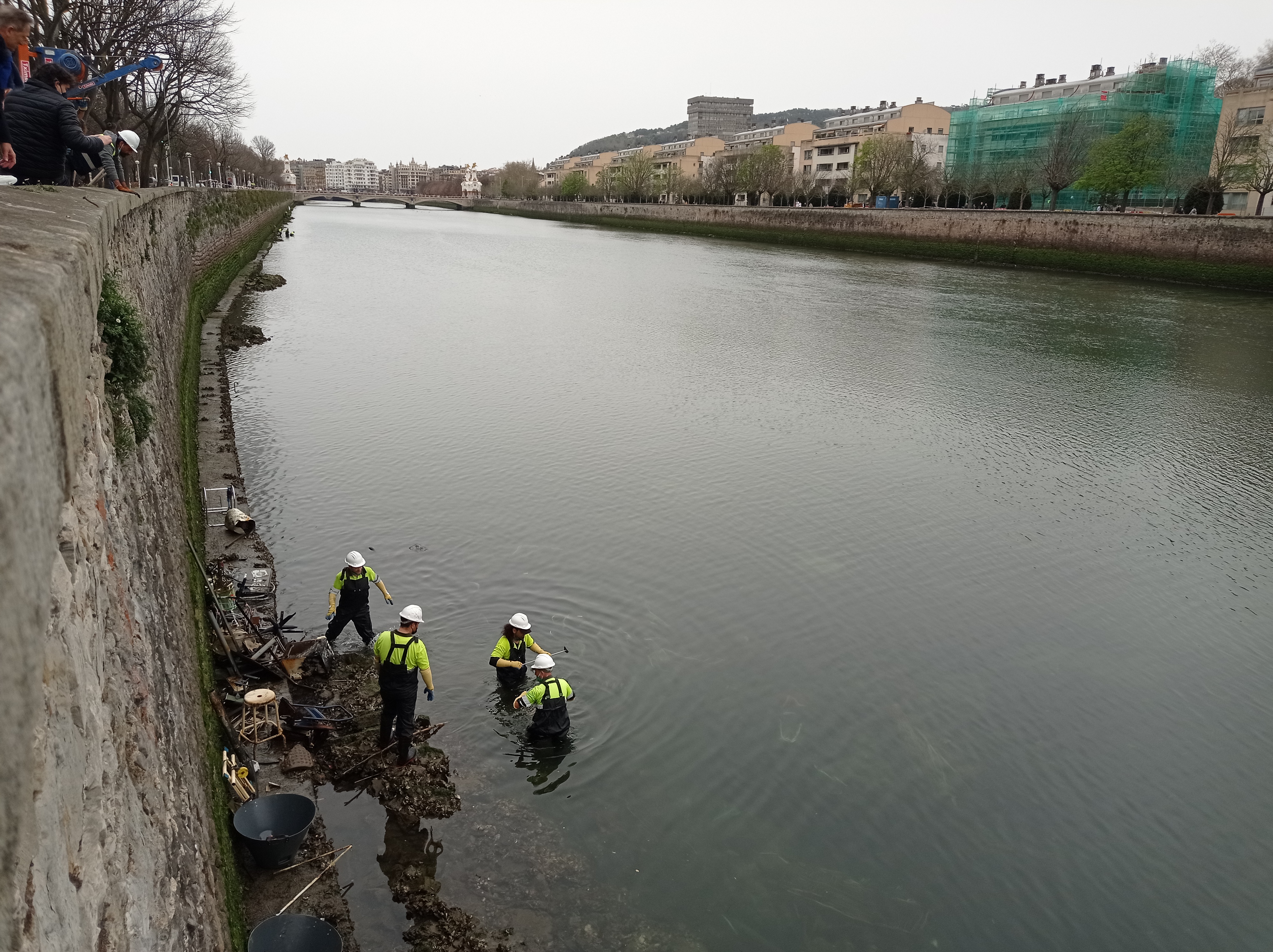 Objetos de tamaño considerable como inodoros, somieres y bicicletas van a dejar de formar parte del paisaje del Urumea, a su paso por el centro de Donostia. El Ayuntamiento ha comenzado a limpiar el lecho del río entre los puentes de María Cristina y Mundaiz, unos trabajos que se extenderán a lo largo de una semana aprovechando las horas de marea baja.