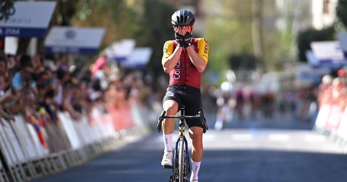 Ion Izagirre besa a su mujer tras la victoria.