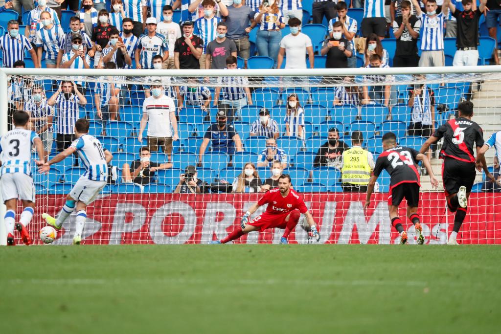 La Real encaró el partido con un once que presentaba tres cambios respecto al alineado una semana antes en el Camp Nou. Isak relevó a Portu en la posición de 9. Barrenetxea, que intercambió varias veces su perfil con Oyarzabal en la primera parte, entró en una de las alas del ataque por Adnan Januzaj. Y Gorosabel fue el lateral diestro en detrimento de Zaldua. El sueco y el de Arrasate son teóricos titulares. Y Barrene, circunstancias de pizarra al margen, merecía la oportunidad tras su muy buen verano. Así que pocos peros se le pueden poner, sobre el papel, al equipo inicial que se midió al Rayo. Un Rayo, por cierto, que tuvo mucho de réplica de aquel Mirandés de Andoni Iraola que visitó Anoeta en la Copa hace año y medio. El técnico visitante, como aquel día, apostó en muchos lances por flotar a Aritz en la salida de balón. Intercambió también el perfil habitual de sus pivotes para que Óscar Valentín se encargara de Silva, como le tocó a Malsa con Odegaard en febrero de 2020. Y, en líneas generales, ordenó una presión bastante adelantada y valiente. Sin embargo, esta vez la Real encontró soluciones para salir airosa de semejante contexto. Las alternó con cierto éxito. Consiguió pisar las inmediaciones del área vallecana con claridad. Pero fue a partir de ahí donde costó encender la luz.
