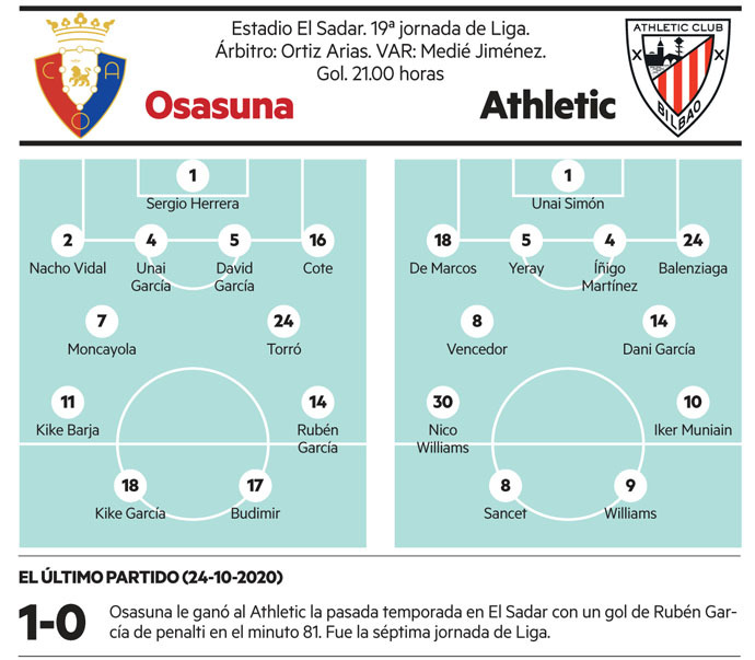 El Athletic, respecto al último partido, el del Real Madrid en San Mamés, recupera a Unai Simón, Iñigo Martínez y Álex Berenguer, que se perdieron ese encuentro tras dar positivo por covid. La alineación no ofrecerá grandes sorpresas y, con los dos internacionales entre los elegidos, será más o menos la habitual. Las bajas, de todos modos, han obligado a la convocatoria de dos chavales, Luis Bilbao y Artola. Nolaskoain vuelve tras año y medio de baja. Pero hay que esperar a los tests.