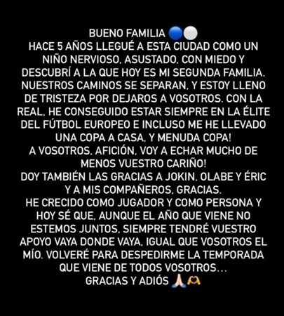 El extremo, que ahora va a disputar cuatro encuentros con su selección, ha dado las gracias a todos sus compañeros, a Aperribay, Olabe y Erik (Bretos). Llama la atención que no ha hecho ninguna mención a Imanol, emplazando a la afición, a la que "os voy a echar mucho de menos", al año que viene para decirle adiós: "Aunque el año que viene no estemos juntos, siempre tendré vuestro apoyo vaya donde vaya, igual que vosotros el mío. Volveré para despedirme. Gracias y adiós".