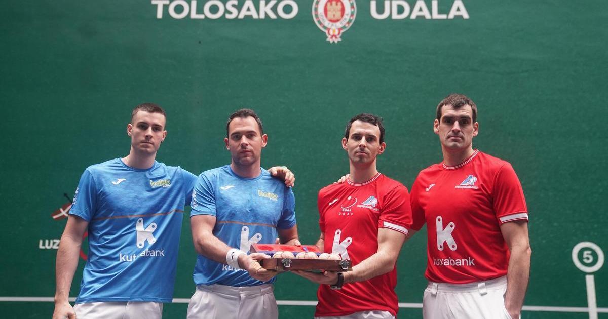 Altuna III-Ezkurdia y Jaka-Iztueta eligen material para la tercera jornada de la liguilla de semifinales del Campeonato de Parejas en el Beotibar de Tolosa.