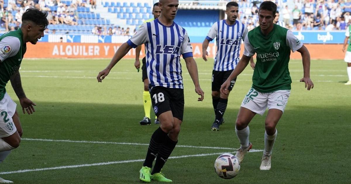 Guridi observa el esférico ante la presión de dos jugadores del Huesca