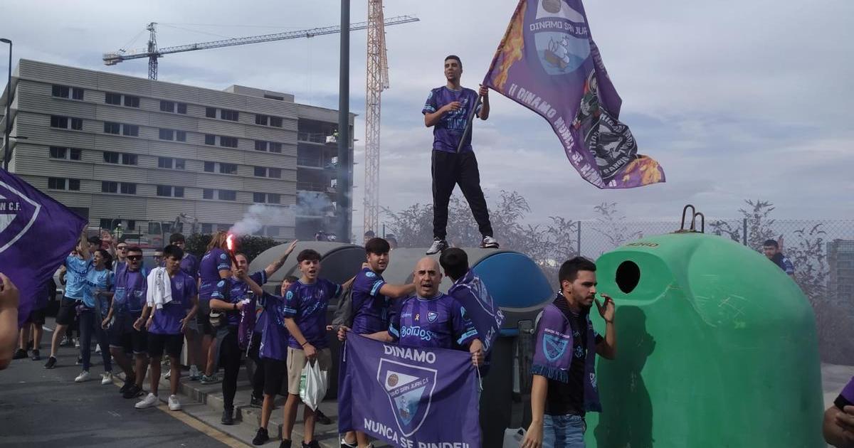 El barrio de San Juan de Santurtzi es un hervidero este miércoles. La afición morada ha despedido con un pasillo, con cánticos y bengalas a la primera plantilla del Dinamo, que dentro de unas horas busca hacer historia y lograr un billete para la primera ronda de la Copa, donde le esperará un rival de Primera División.