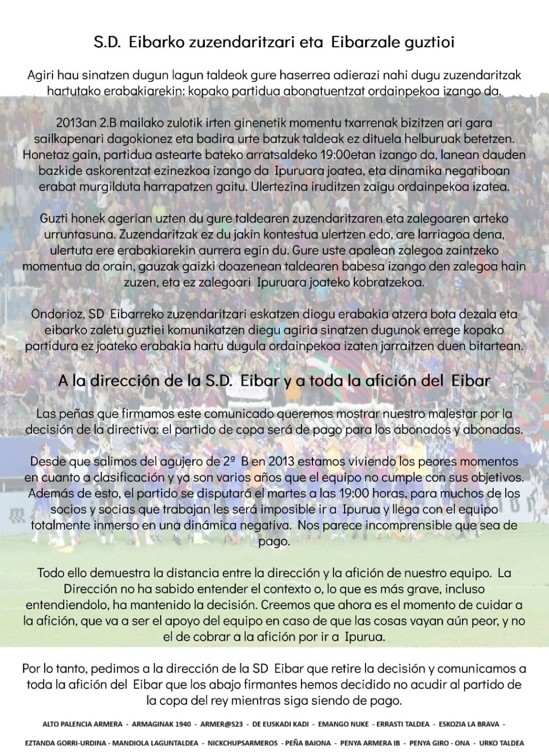 El Eibar anunció recientemente que el partido copero no estaría incluido en el abono de temporada, estableciendo los siguientes precios para sus socios: Adultos, juveniles y jubilados 10 euros e infantil: 5 euros. El gesto no ha gustado en absoluto a la afición, pero el punto que ha encendido la mecha de la protesta es la gestión de la asistencia: "Los y las abonadas que tengan previsto asistir no deberán realizar ningún proceso, pero si no se realiza liberación de asiento, el asiento se considerará ocupado y se efectuará el cobro correspondiente."
