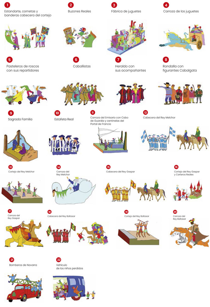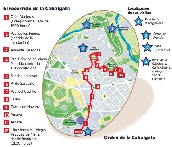 La Cabalgata saldrá a las 19.00 horas desde el Colegio Santa Catalina, en la calle Abejeras y finalizará en el Colegio Vázquez de Mella previsiblemente a eso de las 21.00 horas. El recorrido será el mismo de los últimos años: calle Abejeras, plaza de los Fueros (en dirección contraria), avenida de Zaragoza, plaza Príncipe de Viana (en dirección contraria), calle Sancho el Mayor, plaza del Vínculo, paseo de Sarasate, plaza del Castillo, avenida Carlos III, calle Cortes de Navarra, calle Amaya y calle Arrieta para concluir en el Colegio Vázquez de Mella.