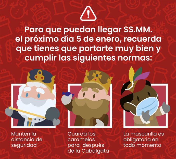 En lo que respecta al público, con la obligatoriedad de llevar en todo momento mascarilla y guardar la distancia de seguridad, una furgoneta al inicio de la cabalgata enumerará estas medidas, los emisarios irán recordándolas continuamente desde su carroza y se entregarán folletos a los más pequeños. Además, cada grupo participante llevará un responsable adulto que se encargará de que se cumplan las medidas durante todo el recorrido.