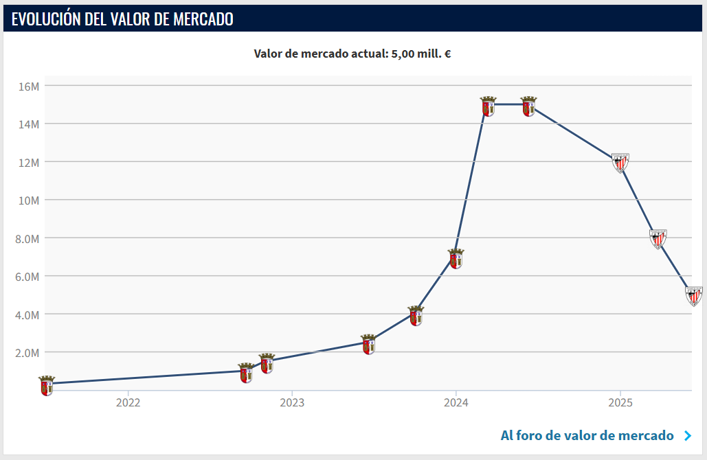 El delantero rojiblanco ha perdido 10 millones de euros de valoración desde que fichó por el Athletic