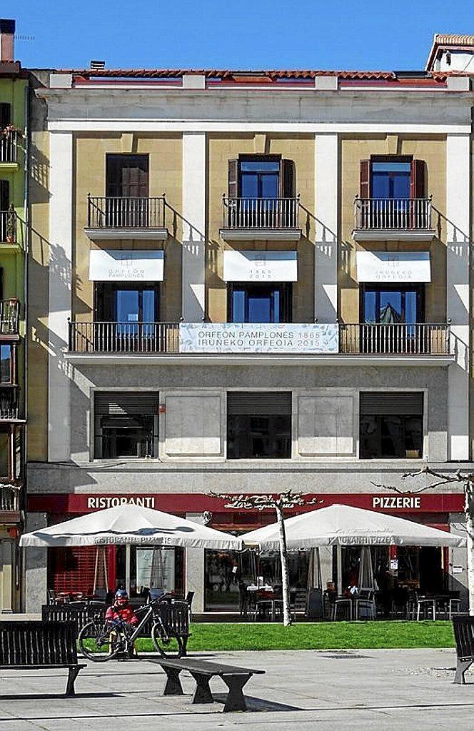 En 1935 la ciudad aún conservaba la memoria de los años en los que las corridas de toros se celebraban en la plaza del Castillo, cuando los toriles estaban instalados en la casa nº 37 de la plaza. En 1844, con la construcción del primer coso taurino, instalado en el arranque de la actual avenida de Carlos III, la vieja casa de los Toriles, que existía desde 1616, perdió su antiguo uso. Al año siguiente se instaló allí el café Suizo que, si bien es cierto que fue cerrado en 1952, al tiempo de la fotografía era el más antiguo de los locales de hostelería pamploneses. La imagen nos muestra el inmueble con su terraza en planta baja, sus largas balconadas y su decoración a base de pilastras clasicistas decoradas con estucos. Vemos que el piso situado sobre el café estaba ocupado por la sede del partido Acción Republicana, fundado en 1925 por Manuel Azaña, y sobre él un foro para el debate intelectual, el Ateneo de Pamplona, que había sido creado en 1932.