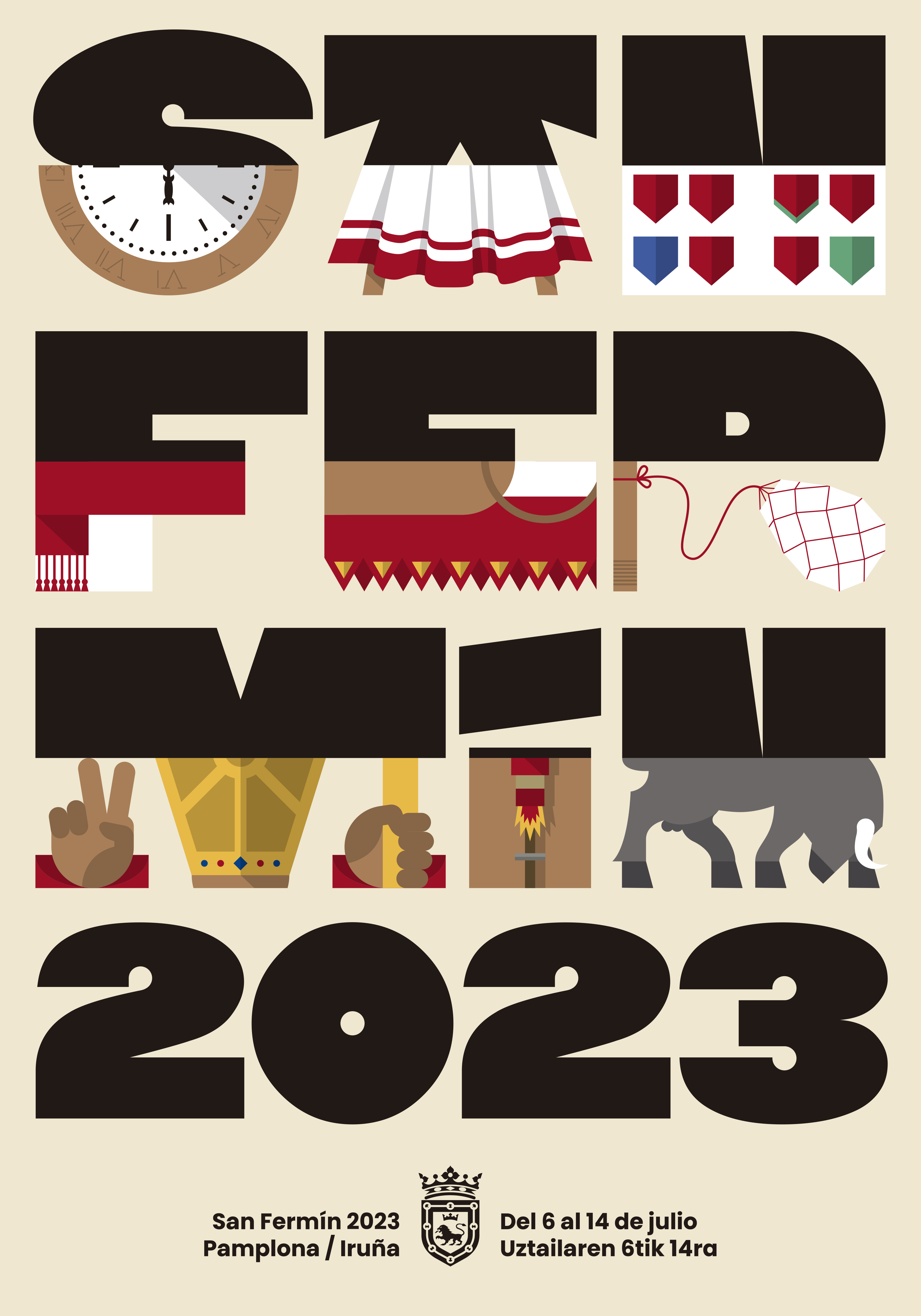 - Valoración del jurado: Cartel seleccionado por la originalidad de ser una composición exclusivamente tipográfica que representa a San Fermín creado a partir de las letras que conforman su nombre. Se han utilizado los positivos y los negativos de los caracteres para representar la figura de San Fermín con una acertada interpretación de cada elemento. Un cartel colorista y alegre que aplica una combinación llamativa de colores para aportar frescura y hacer protagonista al santo de una forma diferente.