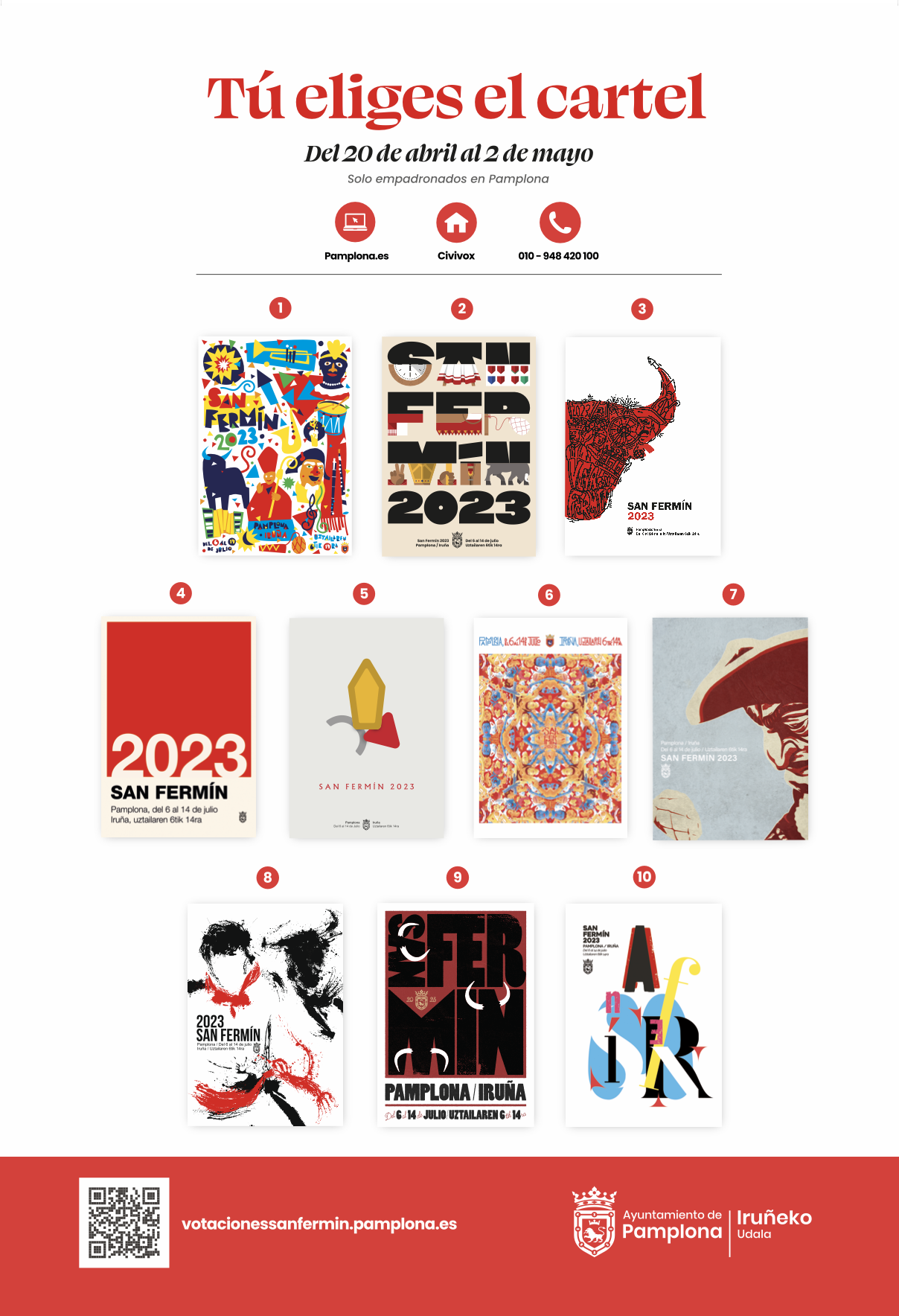 El Ayuntamiento de Pamplona ha dado a conocer los diseños de las diez obras finalistas del Concurso del Cartel de San Fermín 2023. Una vez hechas públicas las obras seleccionadas, ha dado comienzo la votación para elegir el cartel que finalmente anunciará las próximas fiestas de San Fermín. Los diez carteles se expondrán en el Palacio de Condestable hasta el martes 2 de mayo, día en el que finalizará el plazo para que las personas empadronadas en Pamplona puedan votar.