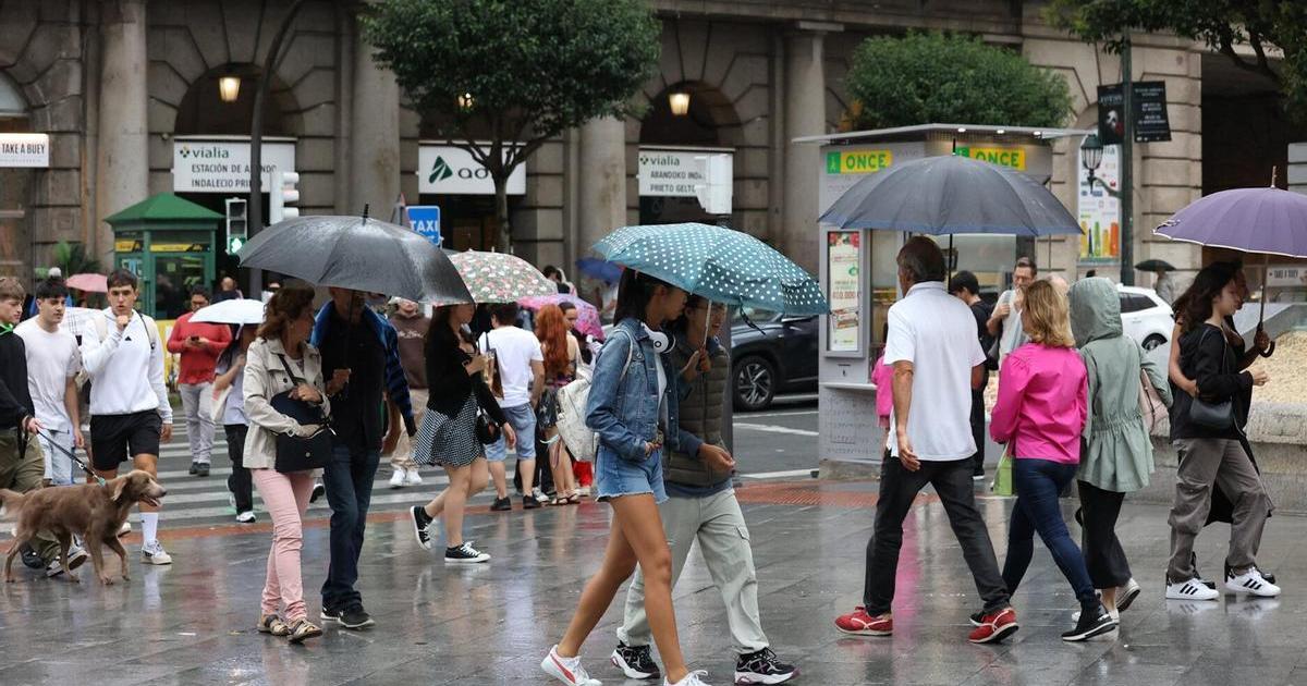 Varias personas se refugian de una fuerte tormenta bajo sus paraguas