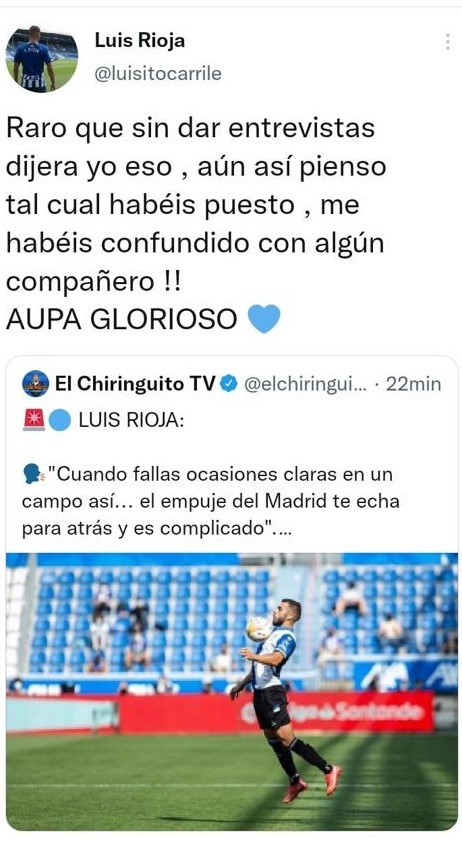"Raro que sin dar entrevistas dijera yo eso, aún así pienso tal cual habéis puesto, me habéis confundido con algún compañero!! Aupa Glorioso", respondió Luis Rioja.