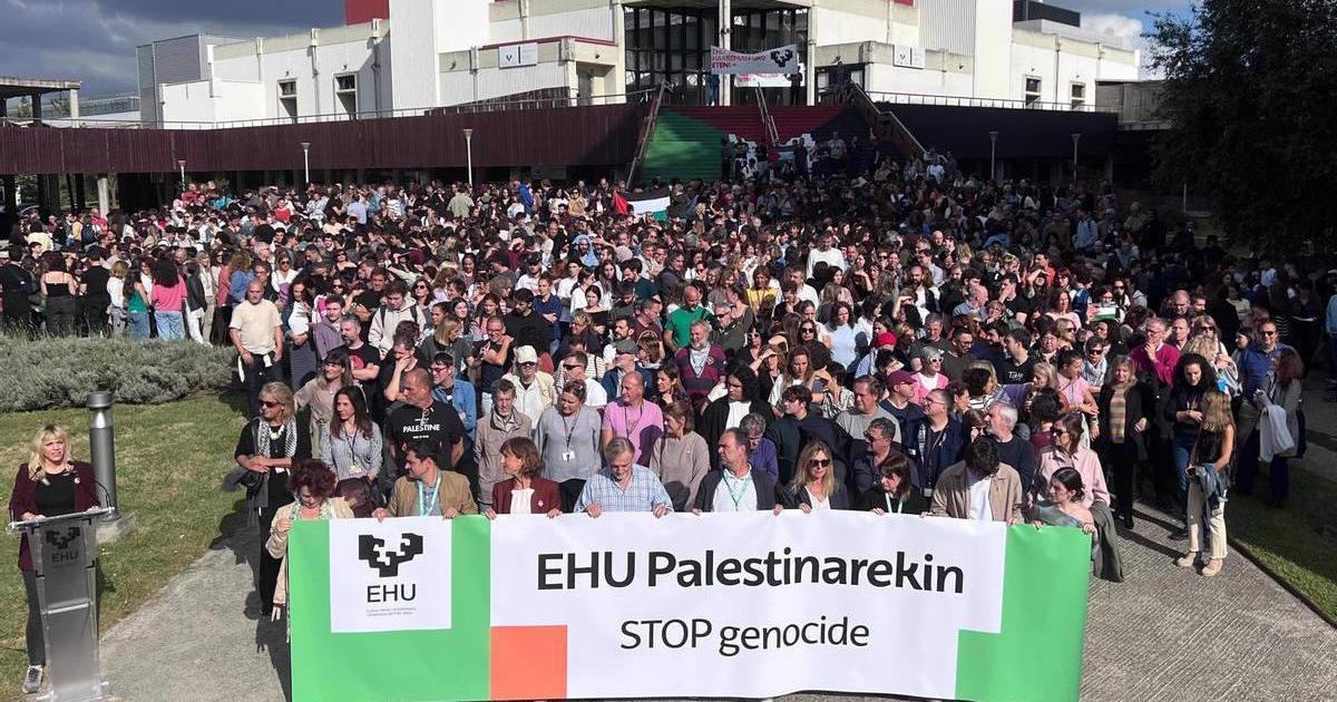 En el campus de Leioa, más de mil personas se han concentrado durante cerca de media hora tras una pancarta en la que se leía "EHU con Palestina. Stop genocidio".