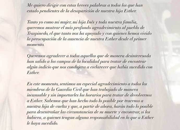 En la misiva que firma el padre de Esther, Miguel López, en nombre de su mujer, su hija Inés, y el resto de la familia, agradece al pueblo de Traspinedo, la pequeña localidad vallisoletana de poco más de 1.100 habitantes en la que viven y en cuyo término municipal fue hallado el cuerpo, todo el apoyo que han recibido desde el primer momento.