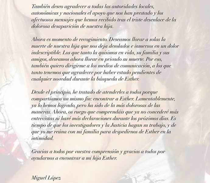 "Es tiempo de que los investigadores y la Justicia hagan su trabajo, y de que yo me reúna con mi familia para despedirnos de Esther en la intimidad", concluye la misiva.