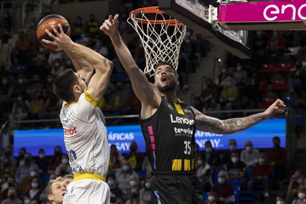 l pívot del Lenovo Tenerife, Guerra, intenta que el alero del Obradoiro, Edgar Vicedo, (i) no tire a canasta Con 16-19 se llegó al término de los primeros diez minutos con dos equipos que no lograban encontrar su lugar en la pista. Bien el Obradoiro aprovechandosu juego interior y un Lenovo Tenerife que con sus ataques muy verticales se mantenía en el partido.