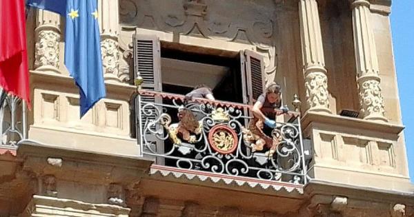A menos dos semanas de que comiencen los Sanfermines el Ayuntamiento de Pamplona ha comenzado a condicionar su fachada exterior. Varios operarios municipales se afanaron ayer en limpiar los adornos y otros elementos decorativo de los balcones del edificio consistorial, que el próximo 6 de julio volverá a centrar la atención de muchos millones de personas en todo el mundo para ver el lanzamiento del Chupinazo. En la imagen se puede ver a dos trabajadoras en uno de los balcones que ocupan los concejales durante el lanzamiento del cohete.