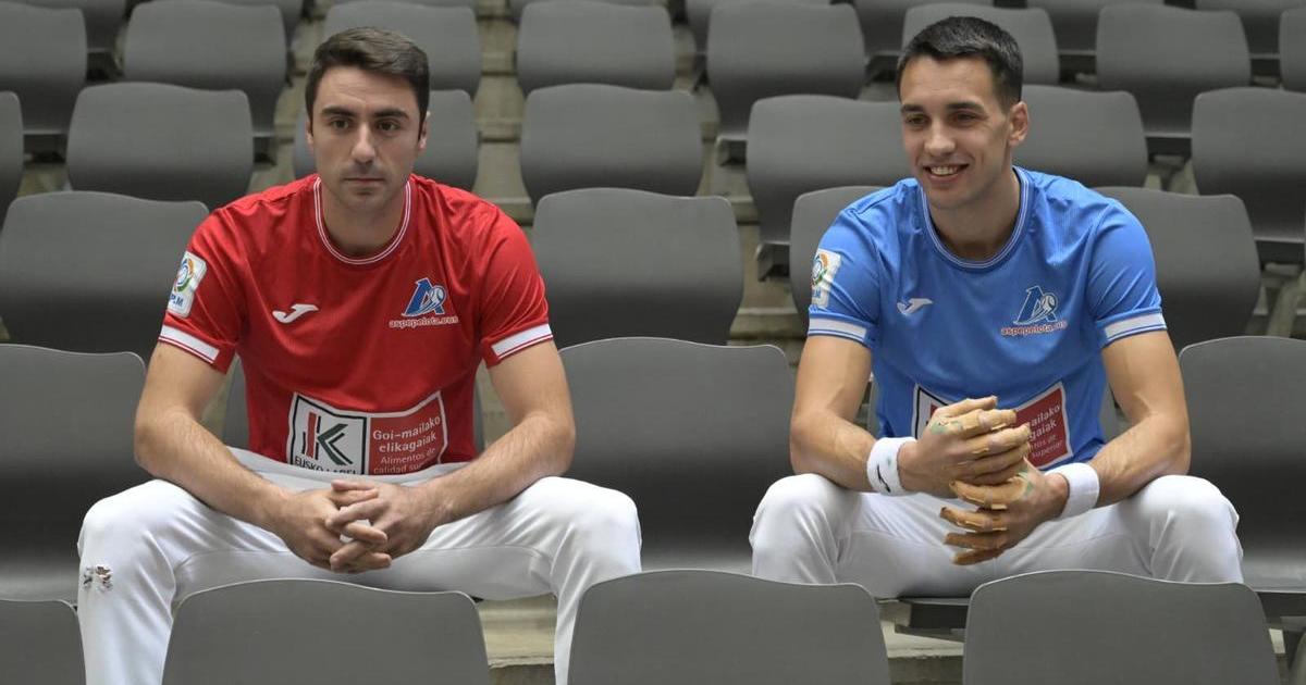 Peio Etxeberria y Javier Zabala posan en las butacas de cancha del frontón Bizkaia de Bilbao, sede de la final del Cuatro y Medio.
