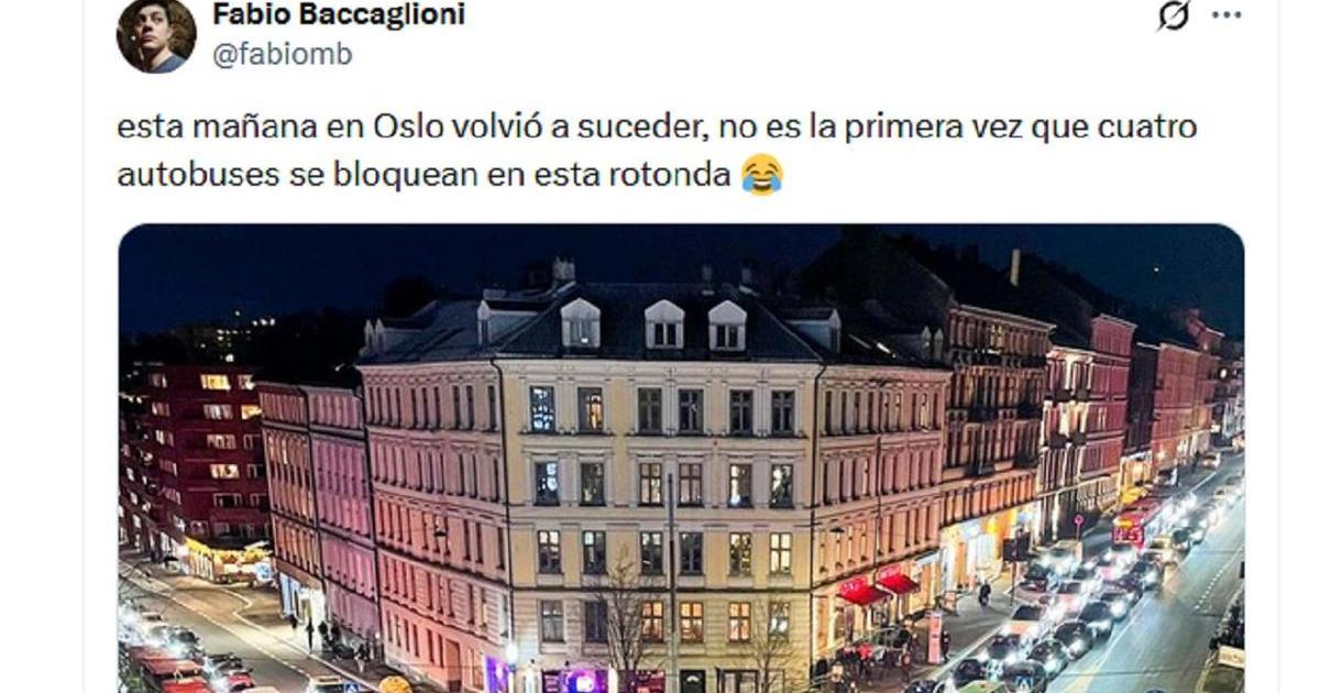 Es lo que refleja exactamente una foto que subía hace unos días el periodista y bloguero argentino Fabio Baccaglioni en la red social X (que aunque pase el tiempo para muchos sigue siendo Twitter). “Esta mañana en Oslo volvió a suceder, no es la primera vez que cuatro autobuses se bloquean en esta rotonda”, escribe en el post.