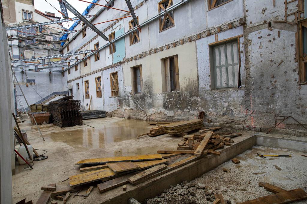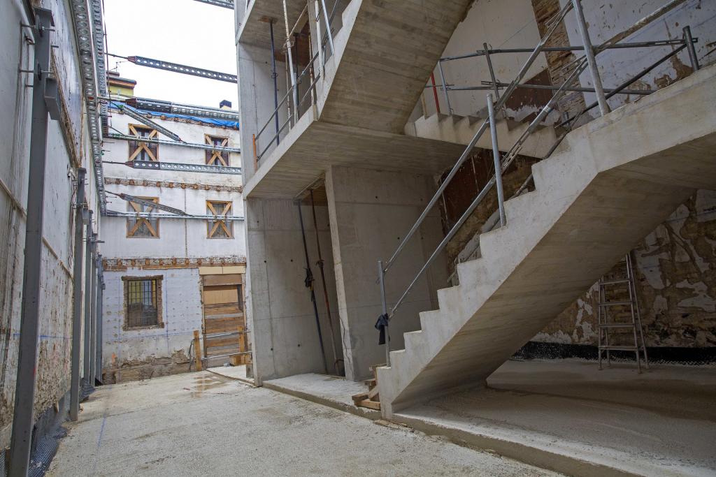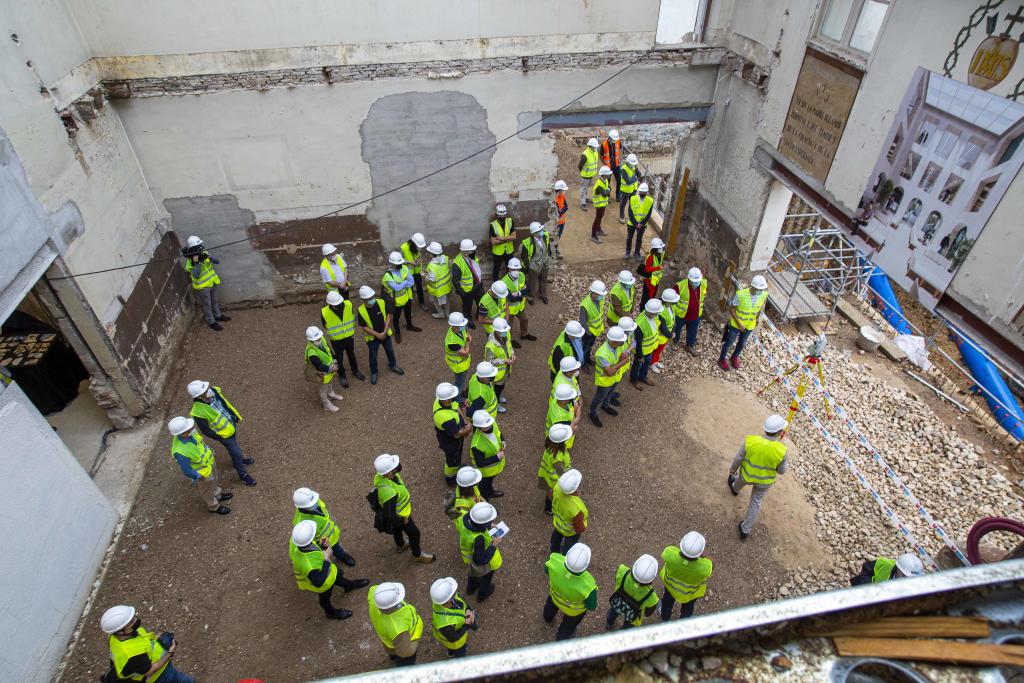 Desde la zona del vestíbulo se ha podido apreciar la complejidad del desmontaje de la estructura del antiguo convento, los arriostramientos de las fachadas, la cimentación con pantallas de micropilotes, y, una vez superada la fase de prospección arqueológica, la excavación y construcción de los sótanos.