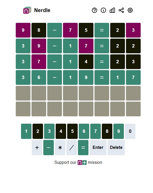Otro juego del que se habla en las redes sociales es Nerdle (nerdlegame.com), que tiene como base las matemáticas y el sistema de seis oportunidades para adivinar la operación aritmética oculta. Una vez jugado, a esperar al día siguiente. También es una página web de libre acceso.