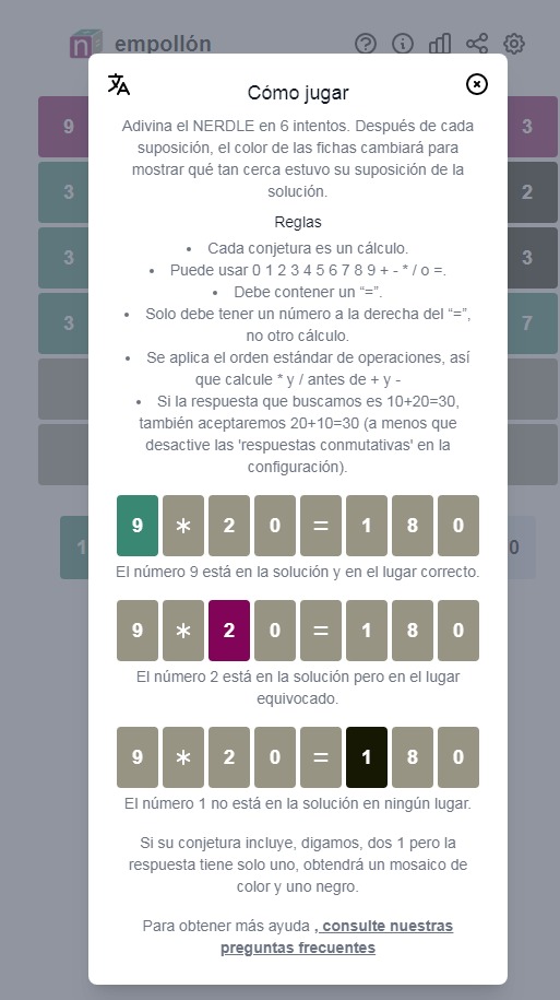 Instrucciones par Nerdle. Son seis las oportunidades. Cada operación que se proponga debe ser correcta y el sígno de igual debe aparecer siempre, aunque no lo hará en la misma casilla.