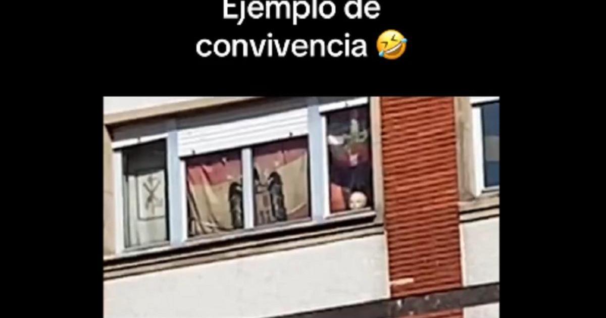 El vídeo, grabado por una mujer desde la calle, bastante lejos del edificio, lleva como título “Ejemplo de convivencia” y un emoji de una carcajada. “Si alguien me puede explicar esto...”, se le oye a la señora al inicio de la grabación, que muestra las ventanas de lo que parece una única estancia del último piso de un bloque en el que aparecen situadas, ocupando toda la superficie de los cristales, diversas banderas, alguna de ellas preconstitucional. “A menos que sea una habitación compartida, ¿cómo es posible que tengamos la cabeza de un muñeco, encima una ikurriña, después una bandera de España con el aguilucho y el escudo de la Guardia Civil? ¿Pero qué popurrí es este?”, dice.