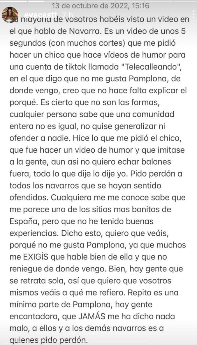 Eva Vildosola Leó, la joven que protagoniza un vídeo que circula desde este martes por las redes sociales en el que asegura que Navarra Navarra es "la peor Comunidad Autónoma de España", ha denunciado en su cuenta de Instagram una oleada de insultos en las redes sociales en algunos de los cuales se hace referencia a su condición de persona transexual. Además, la joven de 22 años y originaria de Pamplona, ha pedido perdón y ha aclarado las circunstancias en las que se grabó el polémico vídeo, que según describe fue realizado en clave de humor y a instancias del autor de la entrevista en la cuenta de Tik Tok @telecalleando