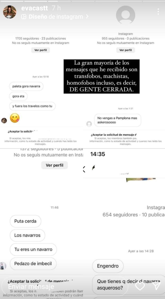 Tras la difusión del vídeo, la joven ha comenzado a recibir mensajes, en su mayoría, según asegura "transfobos, machistas y homófobos", y a cuyos autores califica de "gente cerrada". "Tu eres un navarro" o "Fuera los travelos como tu", son algunos de estos ataques que hacen referencia a su transexualidad.
