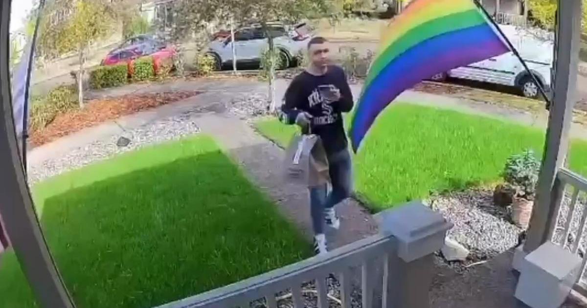 En la entrada a su casa, antes de llegar a la puerta, tienen colgadas dos banderas: la estadounidense (muy americano) y la arcoíris que representa a la comunidad LGTBI. Pues bien, un repartidor tenía que dejar un paquete en esa vivienda y resulta que había mucho viento y la bandera LGTBI ondeaba justo ocupando el espacio que tenía que atravesar el hombre para acceder hasta la puerta.